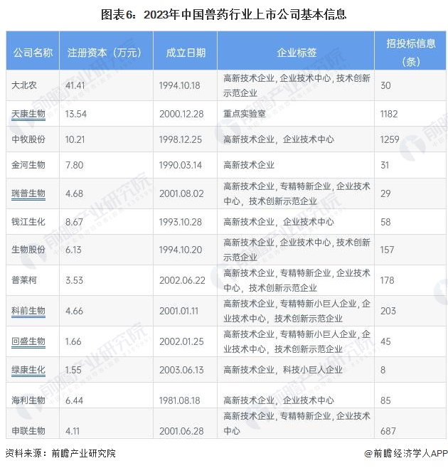 根据兽药行业上市公司已有公开信息,注册资本规模最大的是大北农,超过41亿元,成立时间也较早。招投标信息最多的是中牧股份,其中2023年3月就有多项动物疫病免疫疫苗项目中标。行业内大多数上市公司被评为高新技术企业,企业技术中心等,也有四家企业被评为专精特新企业,整体来说都具备良好的科技创新能力。