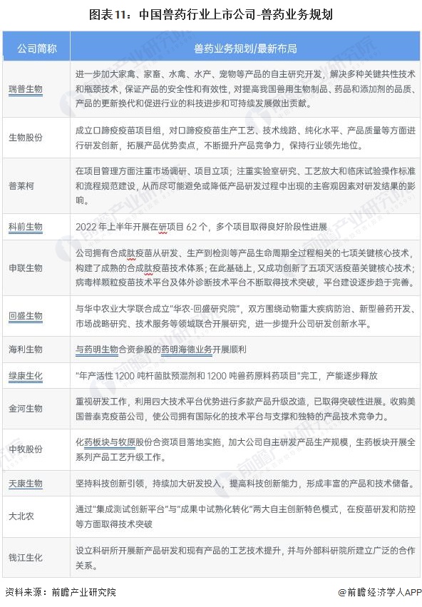 兽药行业上市公司对于兽药相关业务的规划主要集中于研发能力、技术水平的提升,并积极与科研单位合作,此外也包括扩大产能、对外投资、拓展海外业务等,以巩固核心竞争力。