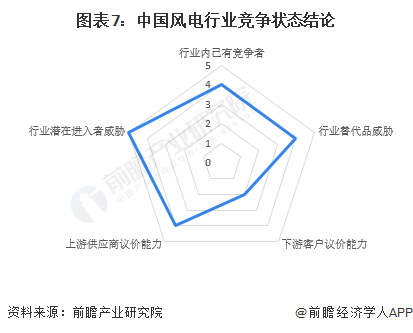综合行业五方面力量对比,可以看整体的竞争强度较大,行业处于结构调整期。根据以上分析,对各方面的竞争情况进行量化,5代表最大,0代表最小,风电行业的竞争情况如下图所示: