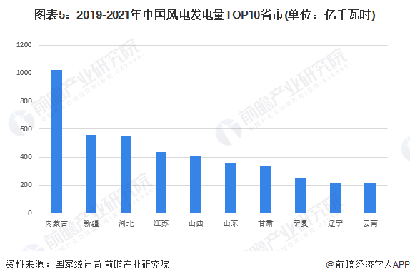 从分省市风电发电量来看,内蒙古风电发电量最多,在2022年,以发电量1019.9亿千瓦时排在全国第一,其次为新疆,发电量为558.4亿千瓦时。