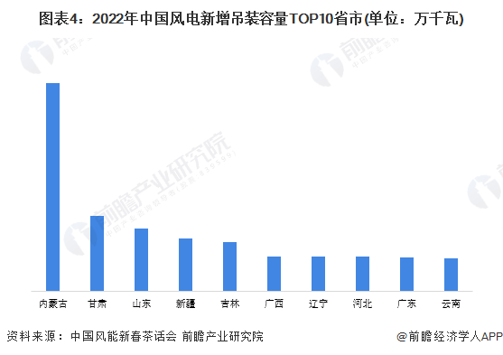 从中国风电新增吊装容量TOP10省市情况来看,根据2023年风能新春茶话会公布的信息,2022年中国风电新增吊装容量最高的省份是内蒙古,内蒙古全年风电新增吊装容量为1243万千瓦,遥遥领先于排名第二的甘肃省。甘肃省2022年风电新增吊装容量452万千瓦。