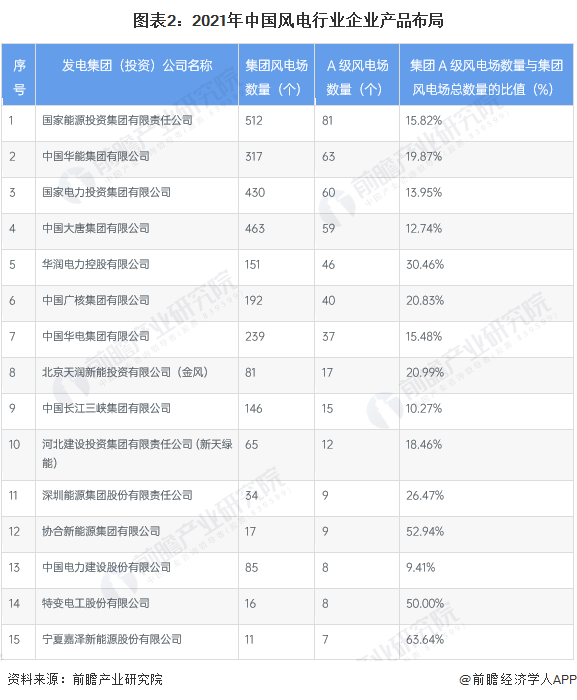 在企业竞争格局方面,根据中国电力企业联合会科技开发服务中心、中国电力企业联合会风力发电技术委员会公布的2021年度电力行业风电运行指标对标结果,其中公布了中国风电场行业领先开发运营商的建设运行情况。
