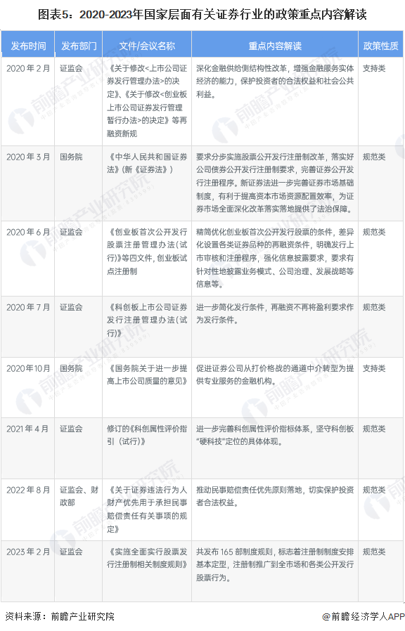 中国证券市场发展已有三十余年,目前逐步迈向成熟。2020年以来,国务院、发改委、证监会和国人民银行等多部门都陆续印发了支持、规范证券行业的发展政策,重要内容主要有完善证券行业相关细则、推行科创板、成立北交所以及推行注册制等。2023年2月,证监会公布实施全面实行股票发行注册制相关制度规则,标志着我国证券市场正式进入注册制。2020-2023年我国证券行业具体政策如下: