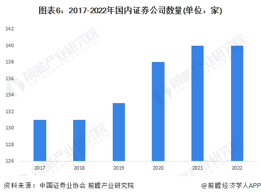 证券行业公司间产品差异较小,行业供给主要体现在证券公司数量以及营业部数量等方面。根据中国证券业协会数据显示,2022年国内证券公司数量共有140家,较2017年的131家多了9家,略有上升。