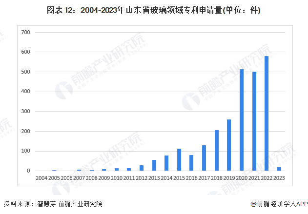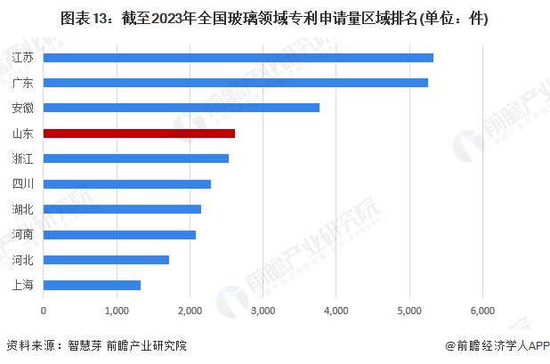 山东省十分注重玻璃产业技术创新,研发能力持续提高。根据智慧芽查询数据显示,自2013年起,山东省玻璃领域专利申请量快速增长。截至2023年4月23日,山东省玻璃领域累计专利申请了突破2500件,位列全国第四,整体上看,山东省玻璃产业研发能力虽与江苏省、广东省存在一定差距,但近年来提升较快,为玻璃产业转型升级提供了有力的支撑。