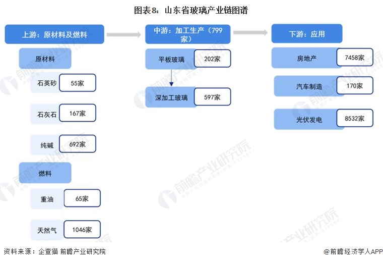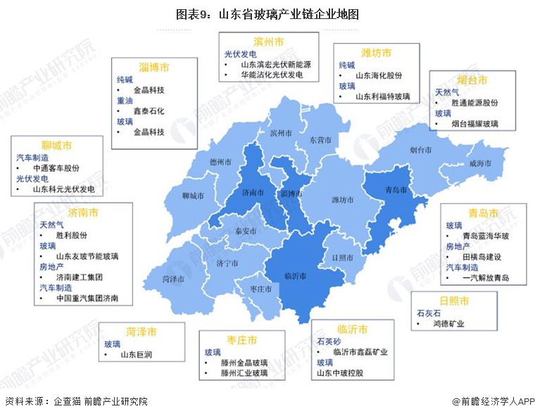 从产业链环节企业分布来看, 上游原材料和燃料企业中,石英砂企业最多分布在临沂市,石灰石企业分布最多的是日照市,纯碱企业主要分布在淄博市和潍坊市,重油企业主要在淄博市,天然气企业主要分布在济南市;中游玻璃加工生产企业主要是金晶集团、中玻控股、山东巨润,分别在淄博市、临沂市和菏泽市,青岛市、济南市、潍坊市也有多家企业分布。下游玻璃应用企业中,房地产企业主要分布在济南市和青岛市,汽车制造企业主要分布在青岛市,光伏发电企业主要分布在聊城市和滨州市。