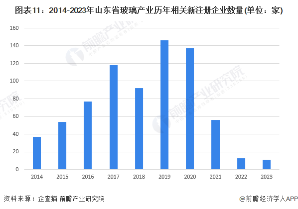 山东省玻璃产业市场集中度高,“十三五”以来金晶集团、中玻控股、山东巨润三家玻璃企业产能占全省玻璃总产能的80%以上。政策制约普通平板玻璃、建筑玻璃新增产能,故2019年来,山东省玻璃产业新增注册企业数量呈下降趋势。但总体来看,山东省玻璃加工生产企业数量较多,实力较强,在政策支持下,玻璃产业转型升级,市场活力较好。