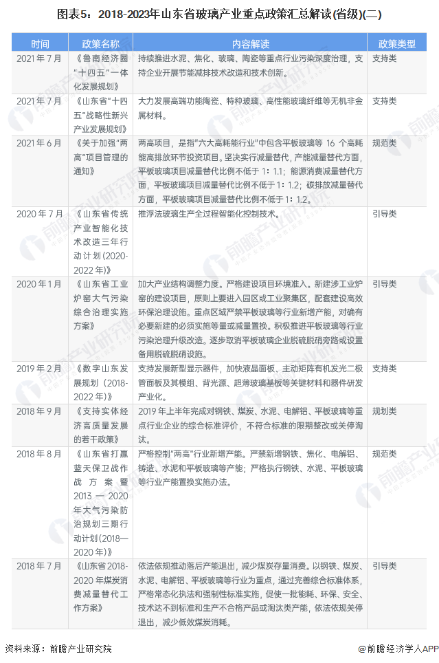 在倡导玻璃产业去产能同时,山东省重点强调玻璃产业朝精深加工发展,绿色发展。2021年11月,山东省工信厅发布《山东省建材工业“十四五”发展规划》,强调“十四五”期间,平板玻璃行业,优化空间布局,提高产业集中度 ,攻克关键技术,补齐产业空白 ,重点发展节能安全玻璃、交通领域玻璃、家电玻璃等锻长板产品,加快发展低辐射镀膜玻璃、超白玻璃、高透型镀膜中空玻璃、真空玻璃、多色镀膜玻璃制品等建筑节能安全玻璃,提高精深加工用玻璃原片比重。2022年3月,山东发展和改革委员发布《山东省“十四五”绿色低碳循环发展规划》,引导玻璃产业降低耗能,绿色发展。