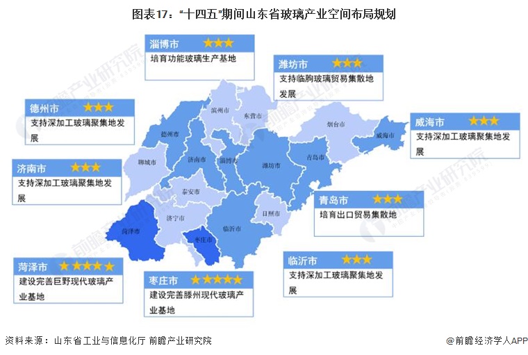 根据《山东省建材工业“十四五”发展规划》,“十四五”期间,山东省将以枣庄、菏泽、济南、德州、临沂、威海、潍坊、淄博、青岛等市为依托,加速玻璃产业发展步伐。“十四五”期间山东省玻璃产业发展空间布局规划如下: