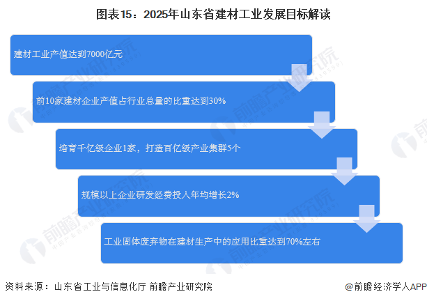 根据《山东省建材工业“十四五”发展规划》,十四五”期间,山东省包括玻璃产业在内的建材工业的发展目标位:发挥领航企业带动作用,攻克一批关键技术,不断“强链补链延链”,提升产业现代化水平,形成以数字经济为引领、生产性服务为支撑、建材传统产业、新兴产业协同发展的新格局,推动山东建材工业向高端化、集群化、智能化、绿色化方向发展。到2025年,建材工业产值达到7000亿元,前10家建材企业产值占行业总量的比重达到30%,培育千亿级企业1家,打造百亿级产业集群5个,规模以上企业研发经费投入年均增长2%,工业固体废弃物在建材生产中的应用比重达到70%左右。