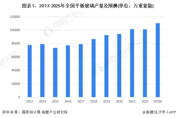 我国平板玻璃产量连续多年保持世界第一。2013-2022年,我国平板玻璃产量整体呈上涨趋势,年复合增长率为2.96%。2022年,我国平板玻璃产量为101278.5万重量箱,同比下降0.38%。《“十四五”原材料工业发展规划》提出科突破高性能功能玻璃等关键材料,严格落实平板玻璃行业产能置换相关政策。国内在持续推进玻璃行业供给侧改革、淘汰过剩产能,给我国平板玻璃行业发展带来了一定挑战。但短期来看,得益于地产投资保持韧性,平板玻璃产销呈现平稳增长态势,平板玻璃下游用途增加,向光伏、电子、药用、等方向延伸,预计未来几年平板玻璃产量将继续保持上涨,至 2025年,平板玻璃产量将超过110000万重量箱。