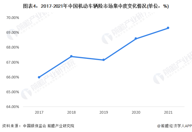 从市场集中度来看,2011年以来,中国大型财险公司快速发展的势头受到遏制,但目前仍然维持在65%-70%之间。2017-2021年,车险市场集中度(CR3)呈波动上升趋势,其中2019年出现小幅下滑,为67.15%,较2018年下降0.24个百分点。2020年中国机动车辆保险市场CR3为68.58%,同比上升1.43个百分点。2021年,我国车险行业的市场集中度进一步提高,CR3为69.5%,龙头企业效应凸显。