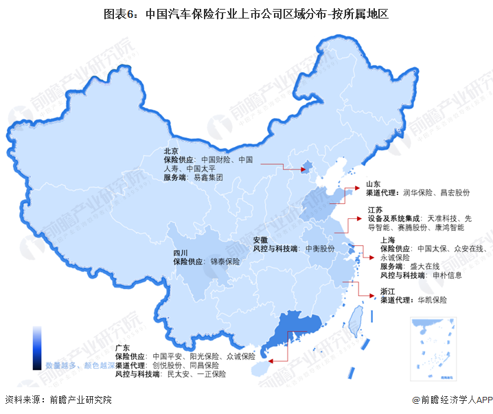 而从上市企业区域分布来看,汽车保险产业上市企业在广东、上海和北京地区的分布较为密集。广东省有中国平安、阳光保险等,北京地区有中国人保财险、中国人寿、中国太平等。