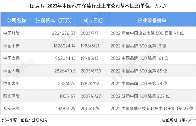 从企业入场进程来看,此处陈列的中国平安、中国太保成立时间均在二十世纪八九十年代,不过旗下的财产保险子公司均在2000年后成立。总体来看,除互联网保险企业众安在线外,汽车保险行业上市公司成立时间均很较早;同时,保险企业需要有大量的资金支持业务开展,因此险企的注册资本均较高,除众安保险和中国太保外,其余险企注册资本均超过一百亿元,中国太保注册资本为96亿元。