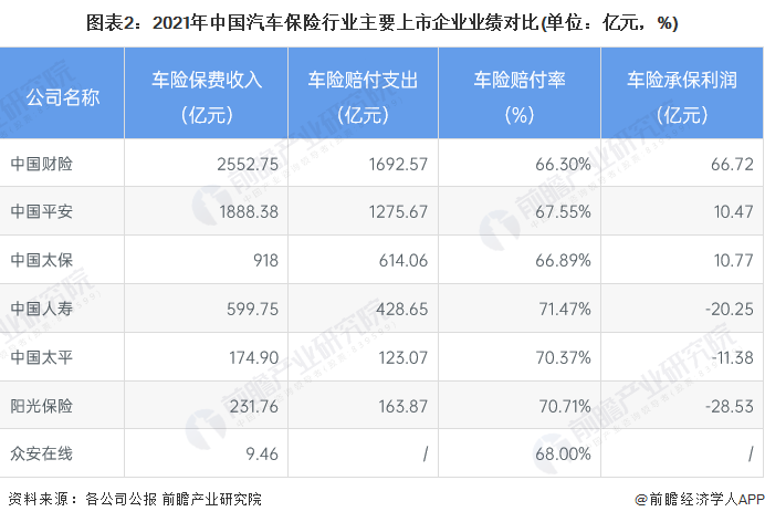 从各财产保险企业披露的报告来看,人保财险、平安产险和太平洋产险是我国车险保费收入最高的三家企业,保费收入高的同时赔付支出也会增加,但企业相对更为成熟的管理能力使得企业能够获得一定的承保利润;随着车险综改的推进,对保险企业的赔付提出了更高要求,2021年各企业车险赔付率均在65%以上。