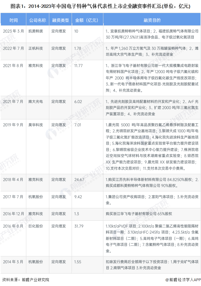 根据代表性上市企业公告的梳理,电子特种气体行业的上市公司融资手段主要通过定向增发方式进行。从整体来看,我国电子特种气体上市企业融资目的主要是用于产能扩增和补充流动资金等。近年来电子特种气体市场主要扩增方向有是电子电子特种气体生产项目。2014-2023年主要的融资事件如下: