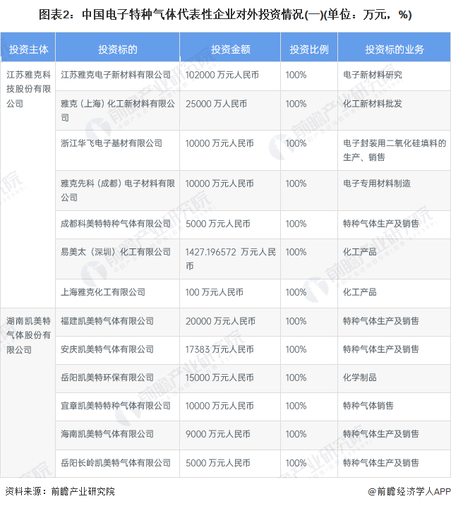 从中国电子特种气体代表性企业的对外投资来看,电子特种气体企业对外投资的企业多为设立子公司布局多样化业务,电子特种气体企业除了经营电子特种气体的生产及销售以外还会顺应市场发展,在电子专用材料上进行业务布局,以满足电子信息制造业的需求。其次企业会通过设立子公司是布局区域生产基地和销售渠道,为拓宽企业整体规模。