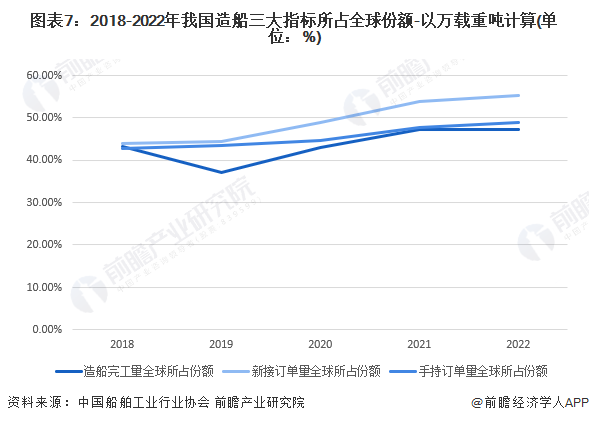 2022年,我国造船国际市场份额已连续13年居世界第一,造船大国地位进一步稳固。我国造船完工量、新接订单量、手持订单量以载重吨计分别占世界总量的47.3%、55.2%和49.0%。整体来看,2018-2022年,我国造船三大指标所占全球份额均呈上涨趋势。