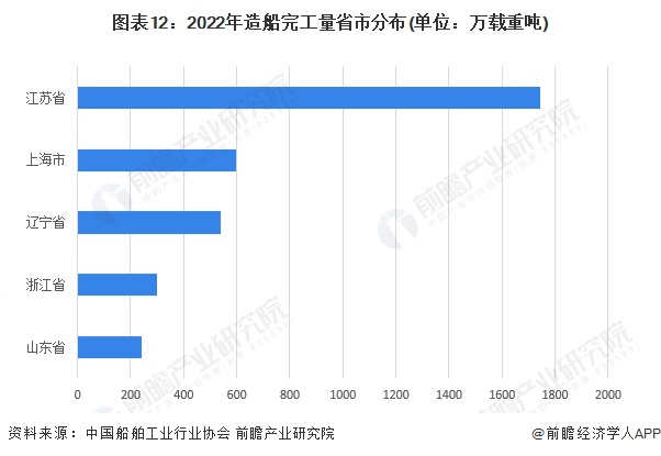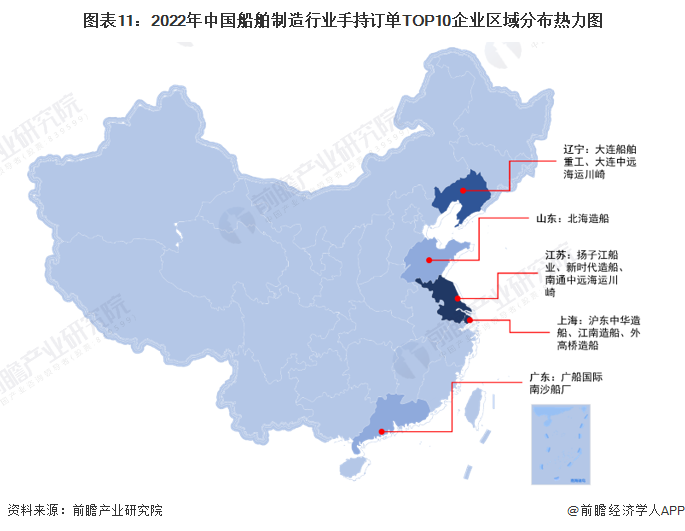 从2022年中国造船完工量前十的企业分布来看,江苏和上海各有3家,辽宁有2家,广东和山东各有一家。