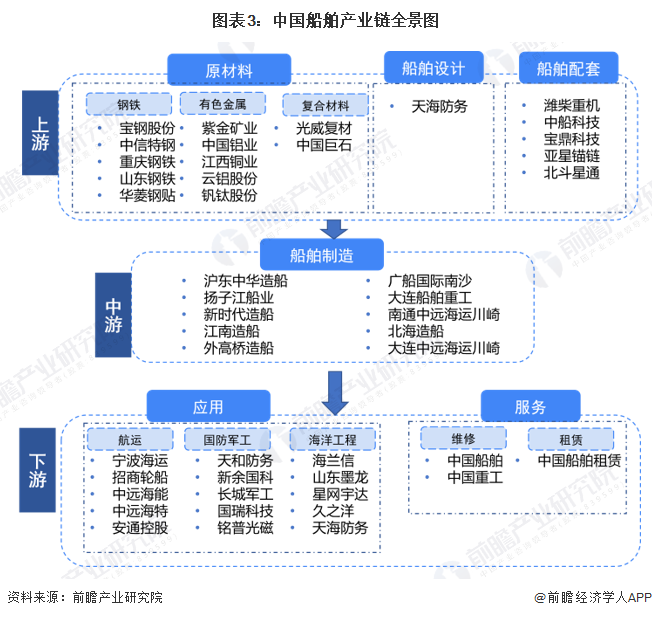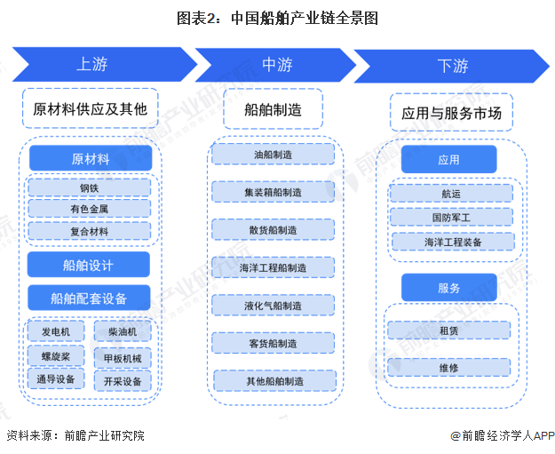 在船舶行业链中,上游为原材料、船舶设计及船舶配套设备供应;中游为船舶制造;下游为航运、国防军工、海洋工程装备等船舶应用领域及租赁、维修等船舶服务环节。其中,船舶制造是核心环节,围绕船舶制造环节,船舶行业形成复杂多样的行业链条。