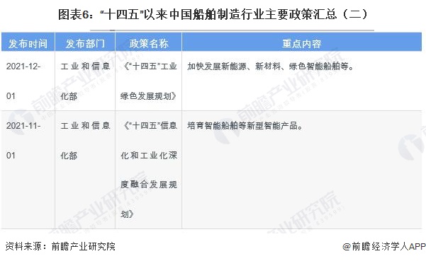 《“十四五”规划和2035远景目标纲要》提出我国将重点发展海洋、海事、航运、船舶相关产业,发展方向为提升产业链供应链现代化水平、推动制造业优化升级、全面推动长江经济带发展,发展具体目标包括实施重型破冰船等研制、推进大型LNG船舶和深海油气生产平台等研发应用。根据之后发布的其他规划,“十四五”期间,我国船舶制造业的政策引导方向是绿色化、智能化。