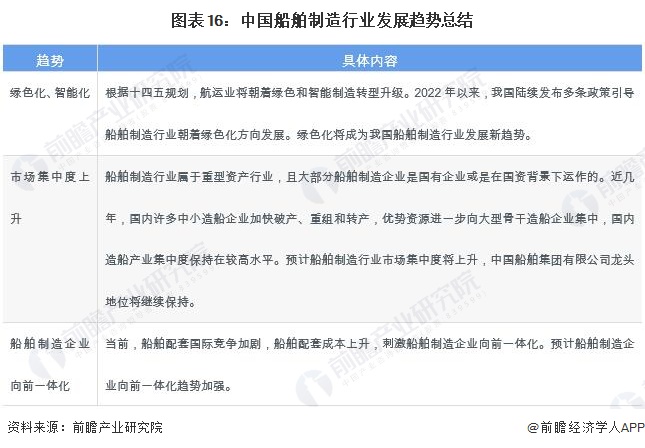 船舶制造行业未来发展或有三大趋势,即绿色化、智能化,市场集中度上升,船舶制造企业向前一体化,具体分析如下: