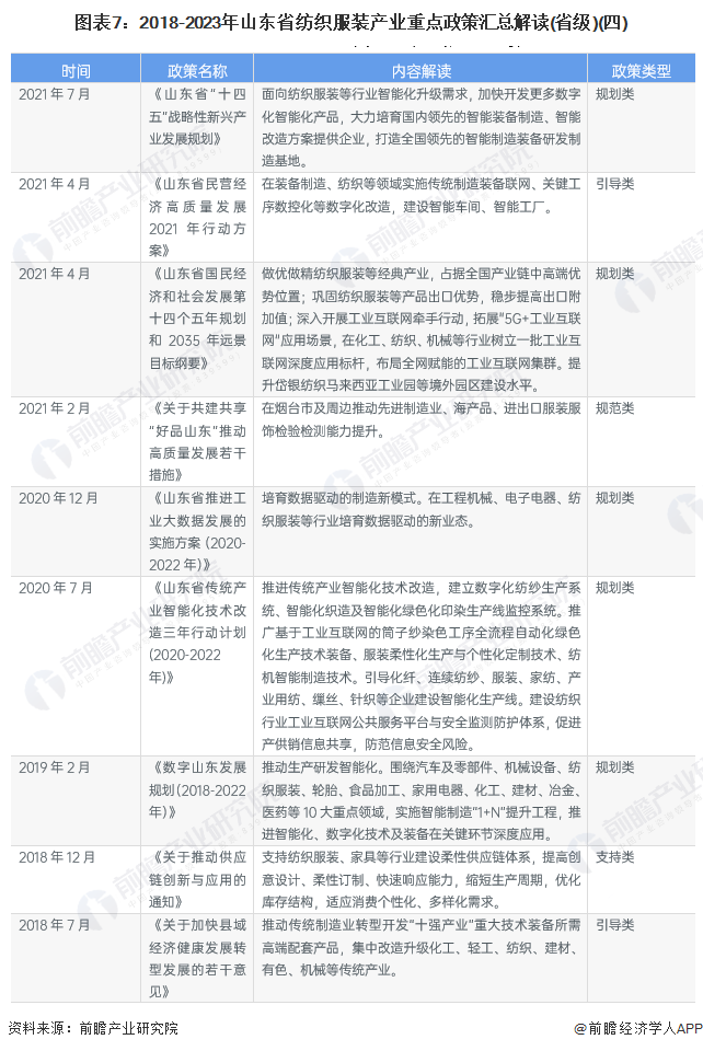 2021年6月,山东省工业和信息化厅发布《关于加快纺织服装产业高质量发展的意见》,提出要进一步加快山东省纺织服装产业高质量发展。“十四五”期间,山东省纺织服装产业发展目标为:到2025年,形成基本完善的融通发展、协同创新、共生共赢的全省性与区域性产业生态系统。全省纺织服装产业通过持续新旧动能转换,产业基础高级化、产业链现代化明显提升,创新驱动的科技产业、文化引领的时尚产业、责任导向的绿色产业特点更加显著,为我国实现制造强国目标发挥重要作用。