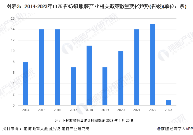 纺织服装产业是山东省的传统优势产业, 2014-2022年,山东省共发布纺织服装产业相关政策100条,每年均有5条以上相关政策发布,2023年,山东省发布了《山东省建设绿色低碳高质量发展先行区三年行动计划(2023-2025年)》,表明了山东省对纺织服装行业的重视与支持。“十三五”期间,山东省提出改造提升传统产业,加快纺织行业提质增效、转型升级。“十四五”以来,山东省陆续发布政策,支持纺织服装行业开展产业链供应链优化升级、开展智能化绿色化转型。