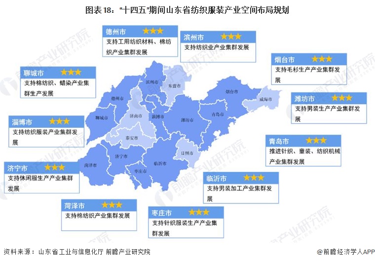 根据《关于加快纺织服装产业高质量发展的意见》,“十四五”期间,山东省将以青岛、烟台、潍坊、滨州、德州、聊城、淄博、济宁、菏泽、枣庄、临沂等市为依托,加速纺织服装产业发展步伐。“十四五”期间山东省纺织服装产业发展空间布局规划如下: