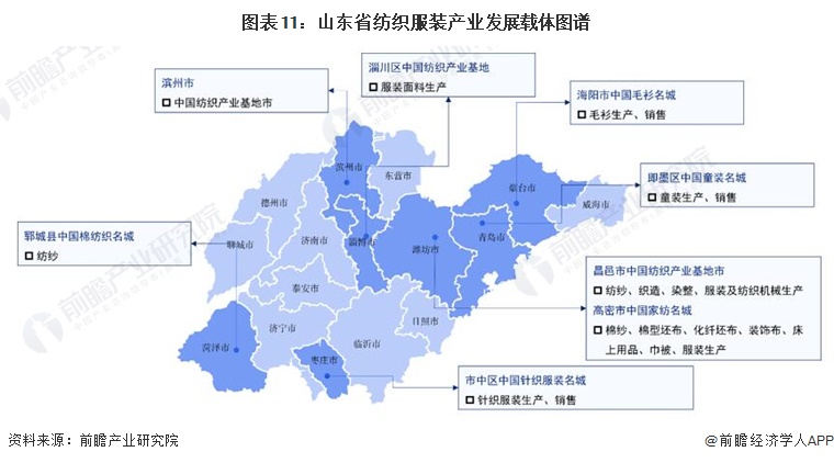 山东省纺织服装产业快速发展,产业集聚效应凸显。现已形成滨州市中国纺织产业基地市、青岛市即墨区中国童装名城、淄博市淄川区中国纺织产业基地市、烟台市海阳市中国毛衫名城、潍坊市昌邑市中国纺织产业基地市、潍坊市高密市中国家纺名城、枣庄市市中区中国针织服装名城、菏泽郓城县中国棉纺织名城等在全国具有较高影响力的特色产业集群。
