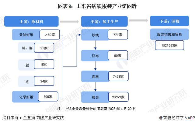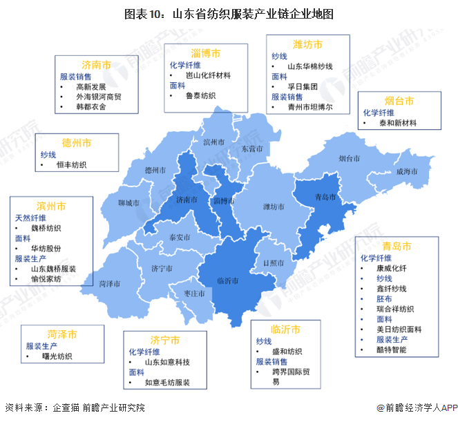 从产业链环节企业分布来看,上游原材料企业中,天然纤维生产企业主要分布在滨州市,化学纤维生产企业主要分布在烟台市和济宁市。中游加工生产企业中,纱线生产企业主要分布在青岛市和临沂市,胚布生产企业主要在潍坊市和滨州市,面料生产企业主要在淄博市、潍坊市和滨州市,服装生产企业主要在青岛市、滨州市和菏泽市。下游服装销售企业主要分布在济南市和青岛市。