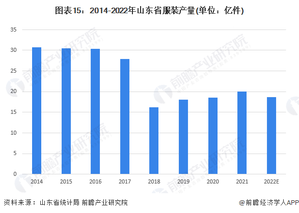 纺织服装产业是山东省的传统优势产业、重要支柱产业和民生产业,在稳增长、促就业、保民生中发挥着重要作用。受多种因素影响,山东省纺织服装产业国际国内竞争优势削弱,产业转型升级压力加大,2014-2018年,山东省服装产量呈下降趋势,随着政策支持纺织服装行业转型升级力度加大,2018-2021年,山东省服装产量呈回升趋势,2021年山东省服装产量为20.01亿件。根据国家统计局披露的数据,2022年,山东省纱和线的产量均下降6.6%,纱和线生产影响着服装生产,故预计2022年山东省服装产量也相应下降,约为18.69亿件。
