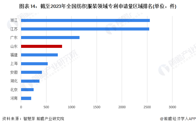山东省十分注重纺织服装技术创新,研发能力持续提高。根据智慧芽查询数据显示,自2010年起,山东省纺织服装领域专利申请量快速增长。截至2023年4月24日,山东省纺织服装领域累计专利申请了突破800件,位列全国第四,整体上看,山东省纺织服装产业研发能力虽与浙江省、江苏省尚有差距,但研发能力提升较快,为纺织服装产业发展提供了有力的支撑。