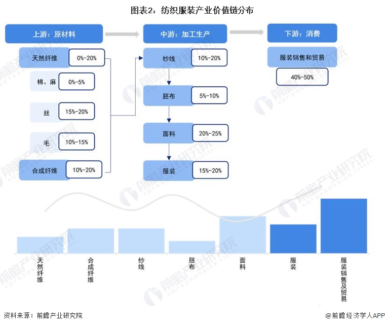 纺织服装产业链上游为原材料供应,包括天然纤维和合成纤维供应,其中天然纤维又分为棉、麻、丝、毛;中游为纺织品及服装加工生产,包括从纱线到胚布,再到面料,最后到服装的整个加工生产过程;下游为服装销售贸易。纺织服装行业的重要核心因素是中上游纺织制造部分,目前这部分企业仍然处于发展中,行业技术水平偏低。