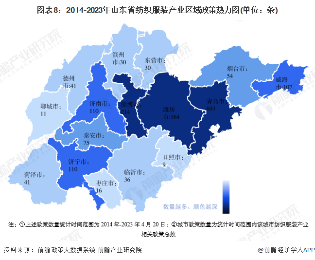 除省级产业政策外,山东省下辖16个地级市也通过出台相关产业发展政策,助推地区纺织服装产业发展。从山东省16个地级市2014年至今发布的纺织服装产业相关政策数量来看,青岛市、淄博市和潍坊市发布的纺织服装产业相关政策数量最多,其中,青岛市相关政策发布达693条,远超其他地级市。青岛市是中国近现代纺织业的发祥地之一,纺织服装作为特色优势产业是青岛消费品工业的重要支撑,在相关政策支持下青岛市纺织服装行业朝着高质量发展方向,继续转型提质。