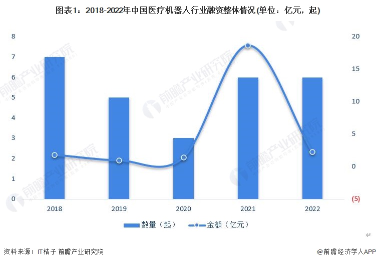 2018-2022年,我国医疗机器人行业的投融资事件呈波动趋势,2018年相关投融事件数量最多,为7起,投融资金额规模1.80亿元。随后投融资市场活跃程度有一定程度下降,且较为波动。2021-2022年,我国医疗机器人行业投融资市场逐渐回温,2022年我国医疗机器人行业的投融资事件数量为6起,金额规模为2.23亿元。