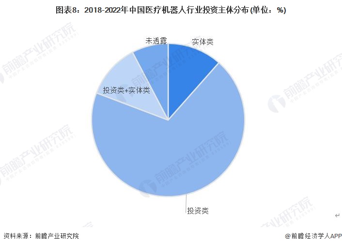 根据对医疗机器人行业投资主体的总结,目前我国医疗机器人行业的投资主体主要以投资类为主,代表性投资主体有观由资本、财信产业基金、沪鼎基金等等;实体类的投资主体有乐普医疗等。