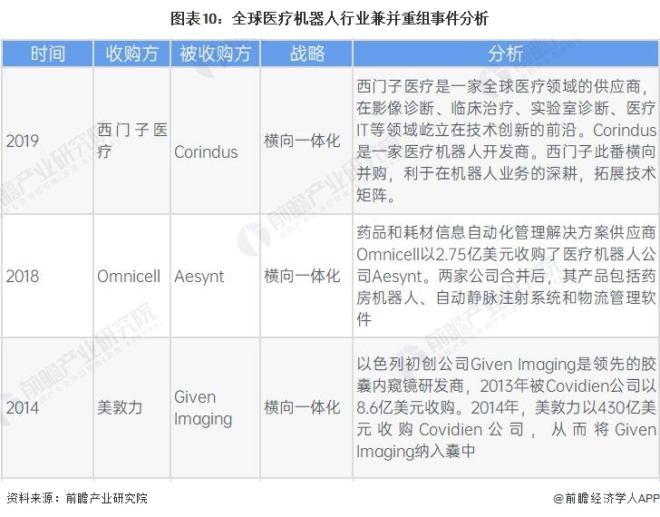 目前全球医疗机器人行业的兼并重组事件主要为横向并购同行企业进行业务的扩张。