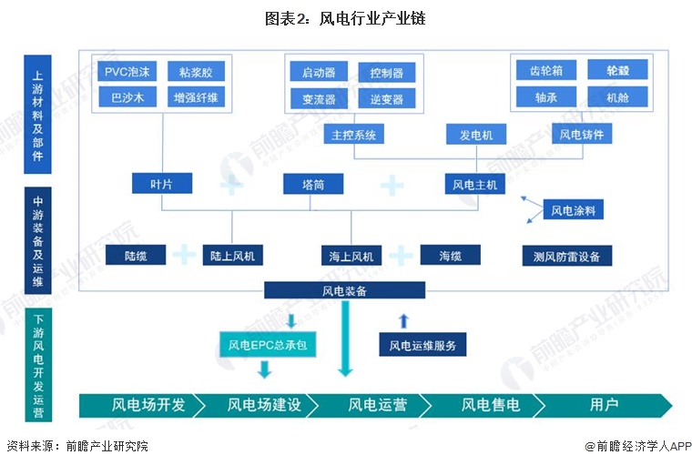 风电行业产业链的上游为风电发电设备原材料、零部件以及其他配套设备制造;中游为风电机组整机、风电设备制造;下游为风电场开发、建设运营及风电售电等。