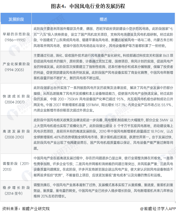 中国风力发电始于20世纪50年代后期,主要是解决海岛和偏远地区供电难的问题,重点是非并网小型风电机组的建设。70年代末期,中国开始进行并网风电的研究,主要是通过引进国外风机建设示范电场。1981年,中国可再生能源学会风能专业委员会成立。1986年,中国第一座“引进机组,商业示范性”风电场-马兰风力发电场在山东荣成并网发电,标志着中国并网风电产业揭开了大幕,并从此走向发展。从中国建成第一个风力发电场至今已近30年,中国并网型风电产业发展大致分为以下6个阶段: