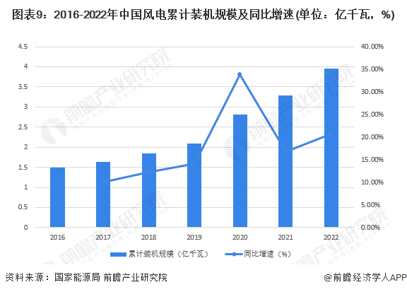 2016-2021年,中国风电行业累计装机规模持续上升,年增幅均保持在10%以上,其中2020年风电累计装机规模达到了33.81%。截至2022年底,中国风电累计装机规模达到了3.96亿千瓦,同比增长20.73%。