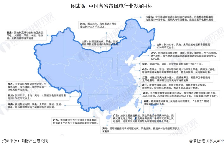 从全国各省市的风电行业发展布局来看,大多数省份在碳达峰实施方案中提出推进使用风力发电建设,部分省份提出风电装机规模发展要求,如河北省到2027年风电、光伏发电装机达到11900万千瓦,湖北省要求到2025年光伏、风电发电总装机达到3200万千瓦,四川省要求到2025年水电、风电、太阳能发电总装机容量达到1.38亿千瓦以上。
