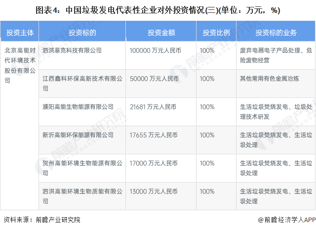 从中国垃圾发电代表性企业的对外投资来看,垃圾发电企业对外投资的企业多为设立子公司布局区域市场,同时把握产业链一体化布局,以便企业降本增效。