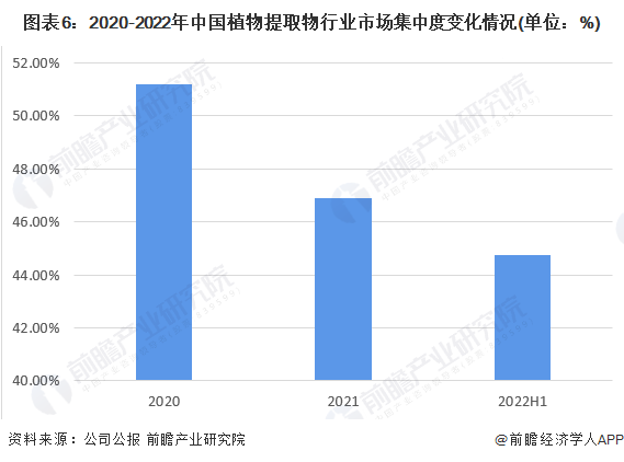 由于植物提取物细分产品多样,应用领域广泛,部分细分领域出现龙头企业,如世界最大辣椒红素生产商晨光生物,业内企业多基于自身业务纵向产业链布局,故即便是植提业务竞争力较强企业,其市占率也较低,加之业内大部分为中小型规模企业,整体市场集中度极为分散。前瞻根据医药保健品出口商会数据测算中国植物提取物行业市场规模;通过汇总植物提取物行业上市公司营业收入,得出2020-2022年,中国植物提取物行业市场集中度有所下降,但头部企业仍然占有很大的竞争优势。