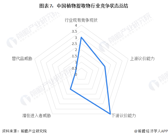 植物提取物是下游各行业产品生产的重要原材料,如医药、化妆品、食品饮料等各个行业都或多或少会使用到植物提取物,因此某一单一市场波动对植物提取物带来的影响较小,植物提取物对下游行业议价能力较强。同时,因行业存在技术门槛较高,潜在进入者威胁较小。