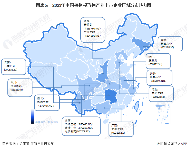 从植物提取物产业上市公司的地区分布来看,湖南植物提取物产业的上市企业数量最多,其中不乏华康生物(870480.NQ)、康隆生物(872213.NQ)和九典制药(300705.SZ)等企业。陕西植物提取物产业的上市企业数量亦较多,有天然谷(833760.NQ)和岳达生物(834891.NQ)等上市企业。