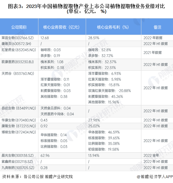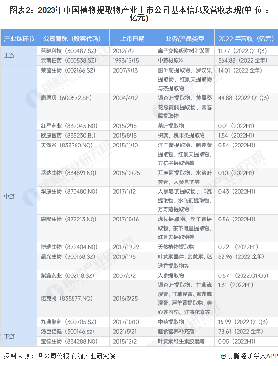 目前,我国植物提取物产业中游上市企业主要包括莱茵生物(002166.SZ)、岳达生物(834891.NQ)、华康生物(870480.NQ)、康隆生物(872213.NQ)等。