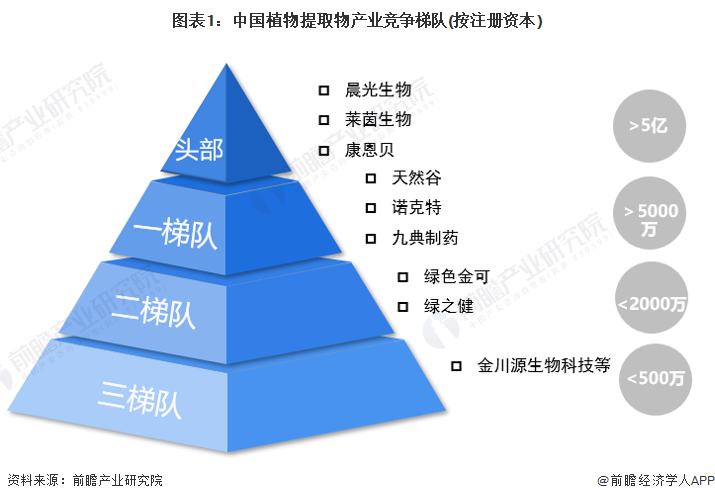 第一梯队包括部分新三板挂牌公司,如天然谷、诺克特、九典制药等,有一定市场知名度,在植物提取物领域多元化布局,市场规模持续扩大;
