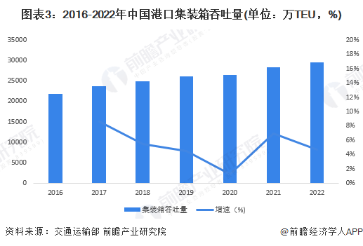 2016-2022年,中国港口集装箱吞吐量不断上升。2022年,中国集装箱港口吞吐量为2.96亿标箱,同比增长4.7%。
