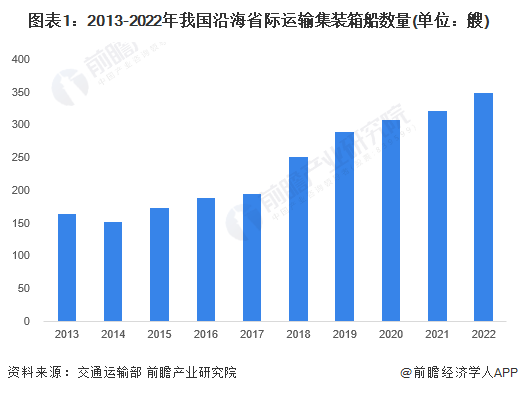 海运指的是海上运输,是使用船舶通过海上航道在不同国家和地区的港口之间运送货物的一种方式,是国际贸易中最主要的运输方式,其中集装箱运输是海上运输的重要货物之一。截至2022年12月31日,我国沿海省际运输集装箱船(700TEU以上,不含多用途船,下同)共计350艘,较2021年底增加28艘,集装箱船数量同比增长8.7%。